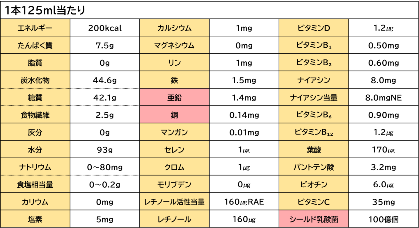 1本125ml当たり、エネルギー200kcal、たんぱく質7.5gを摂取できます💪✨クリミール同様、森永乳業独自の『シールド乳酸菌』が100億個配合されています。
