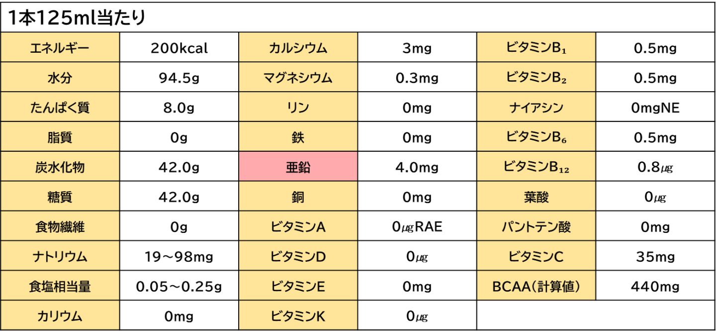 1本125ml当たり、エネルギー200kcal、たんぱく質8.0gを摂取できます💪✨すっきりクリミールと比較すると0.5g多くのたんぱく質が含まれていますが、ビタミン・ミネラル類に関しては、入っていない物もあります。