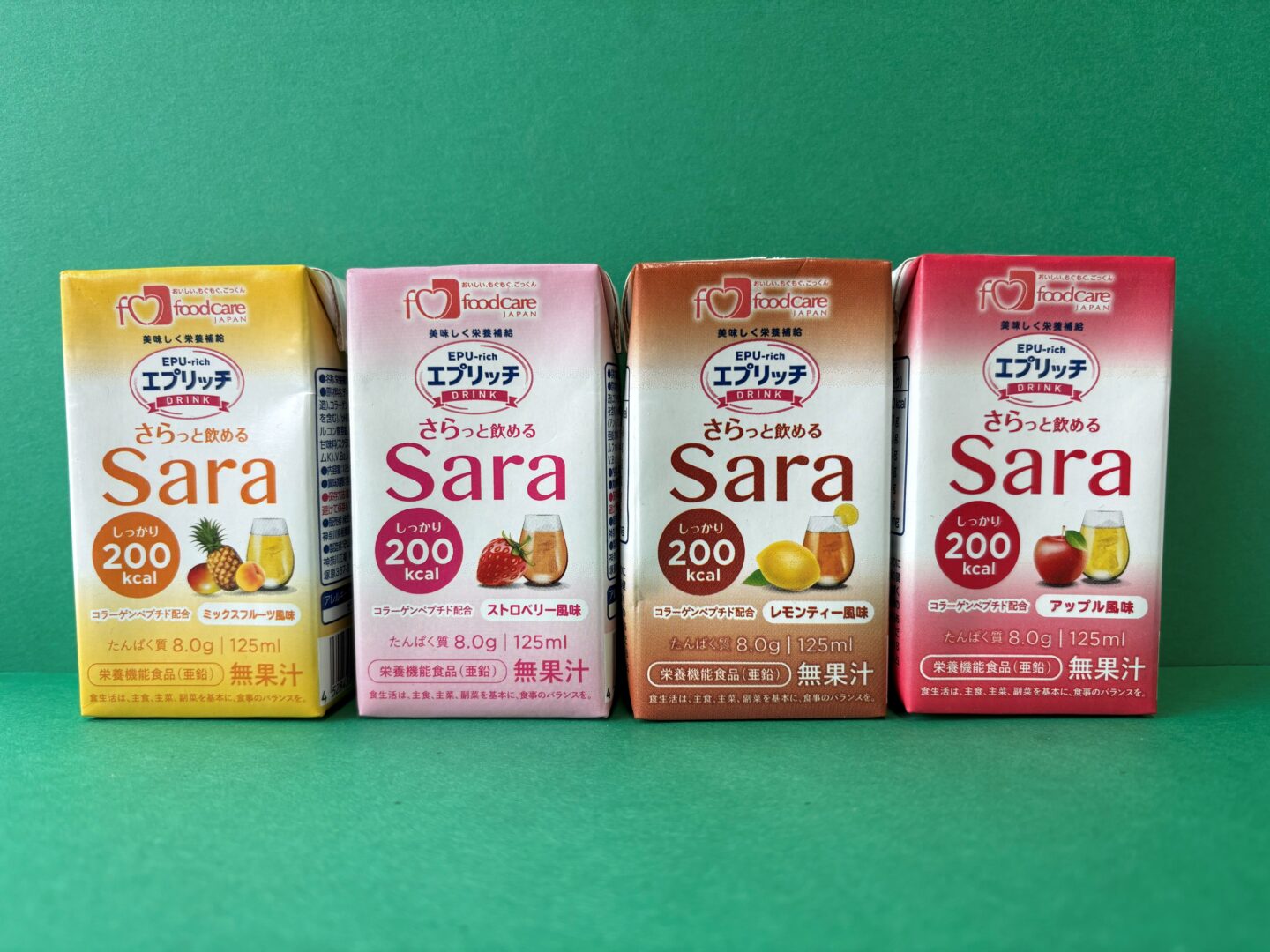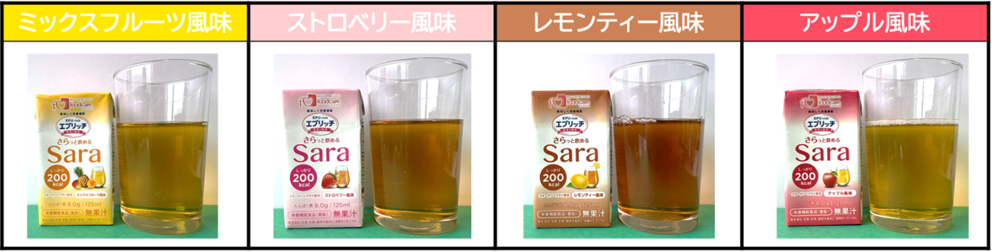 エプリッチドリンクSaraは「ミックスフルーツ風味」、「ストロベリー風味」、「レモンティー風味」、「アップル風味」の全4種類あります。